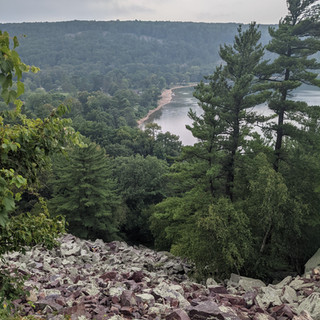 We planned for a full day of hiking at Devil’s Lake State Park. Well, we didn’t entirely know what we were planning, since the trail maps from the website didn’t indicate elevation! We started out on the relatively easy East Bluff Trail, which allowed us to see our first cool rock formation, Elephant Rock. We continued upward on this path until it branched out for us to see Balanced Rock, and then we ended up descending on the Balanced Rock Trail. This was such a fun trail, they had carved and shaped a wonderful little staircase out of the tumbled rocks off the side of the mountain. Once we reached the bottom, it dawned on us that the loop we planned to next pass Devil’s Doorway led us all the way back up the mountainside! So we took it easy on the Grotto’s Trail before trekking straight back up on the Pothole’s Trail. I had been missing some elevation gains on our hikes and Devil’s Lake really dished some up for us! It was all worth it to see all the incredible rock formations and potholes, as well as the stunning lake views. After our down-and-up, we took the more relaxed East Bluff Woods Trail to complete our loop and head back to Charlotte. Where we both immediately needed parking lot showers! A funny little perk of bus life.